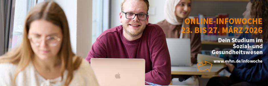 Abi und dann? Ausbildung und Studium? Schon im Berufsleben und studieren? In der Info- und Beratungswoche vom 23. bis 27. März 2026 informieren Lehrende und Studierende der EVHN über Studiengänge in den Bereichen Soziale Arbeit, Sozial- und Gesundheitswirtschaft, Pädagogik, Pflege, Management sowie Religionspädagogik und Diakonik. Darüber hinaus gibt es u.a Informationen über die Möglichkeit, im Ausland zu studieren oder ein Praktikum zu absolvieren, Themen rund um die Studienberatung u. v. m.